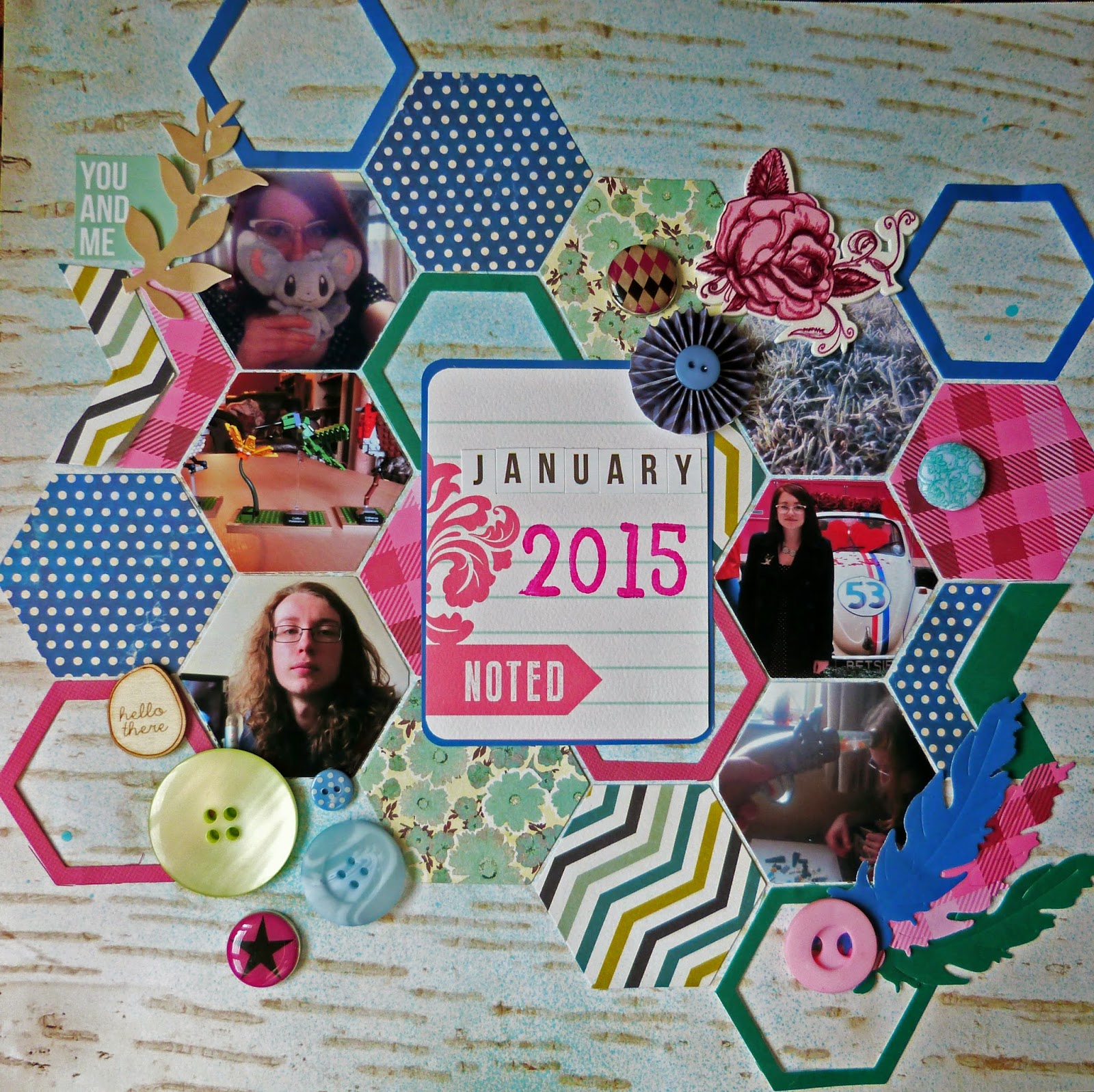 Been getting back into scrapping this week. I haven't been anywhere really to take pictures this month, but I printed off the few I did take and die cut them into hexagon shapes. I'm starting a new scrapbook and I thought this made a great page to start off the year.